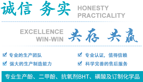 專業生產對,苯磺酸,苯酚磺酸等磺酸類產品及抗氧劑的生產:如抗氧劑300,抗氧劑BHT等;酚類產品有間苯二酚、鄰甲酚及間甲酚等